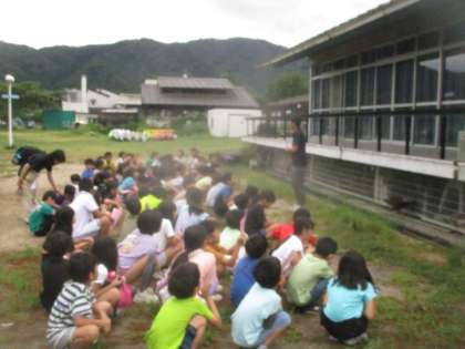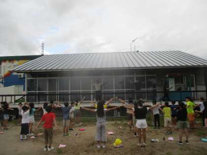 朝の集いでは、みんなで浜辺に行ってラジオ体操をしました。