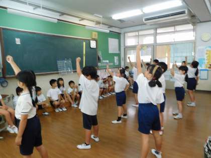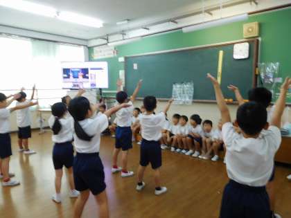 「笑顔で踊る」「大きく踊る」「ポーズを工夫する」といっためあてを一人一人が立てて頑張っています。リズムに乗ってみんなで楽しく踊れるようになってきました。