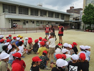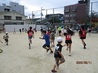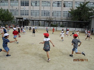中間休みに5・6年生の体育委員会が企画した「ふえおに大会」に参加しました。体育委員会の3人のおにから必死に逃げたり、捕まってもほかの子をタッチするために追いかけたりして楽しく活動することができました。5・6年生と一緒に遊ぶことができてとても楽しそうでした。