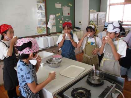 家庭科「食べて元気!ご飯とみそ汁」の学習では、自分たちでこんぶとかつおでだしをとって味わいました。それぞれのだしの味の違いにも気付きました。