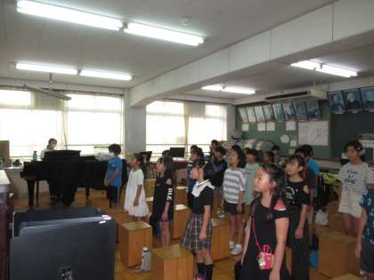学校の代表として3年生児童が、式典の中で、お祝いの言葉と歌のプレゼントをしました。音楽室で最後の練習をしてから、体育館に向かいました。歌は音楽の時間に練習した「ふじ山」と「にじ」の2曲を歌いました。