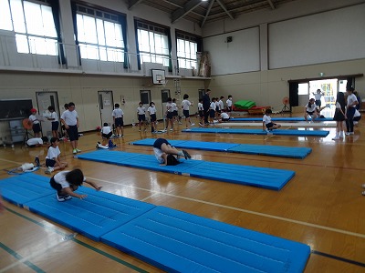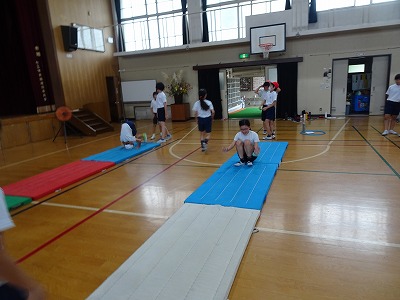 マット運動の学習をすすめています。ねらい1では、できる技の連続技や組合わせ技にチャレンジします。友達とアドバイスをし合いながら頑張りました。
