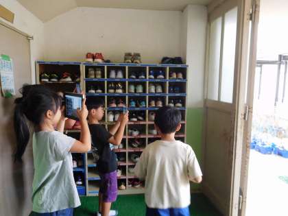 まず、学校の中で「顔」に見える自然や造形物「ともだち」を見つけ、写真におさめました。
