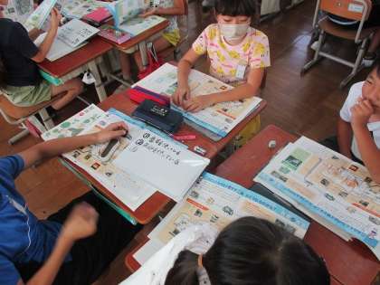 1学期に社会科「くらしとごみ」の調べ学習で使用したごみ処理場のパンフレットを、今回は文章の書き方や図の見せ方に注目して見てみました。同じパンフレットでも少し見方を変えるだけで違った発見がたくさんありました!