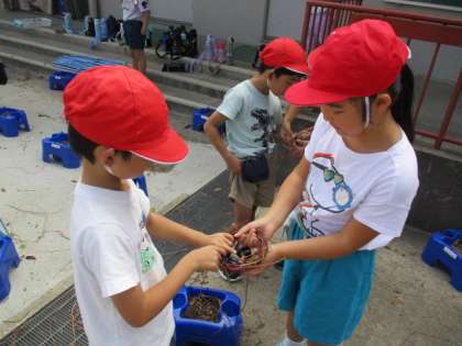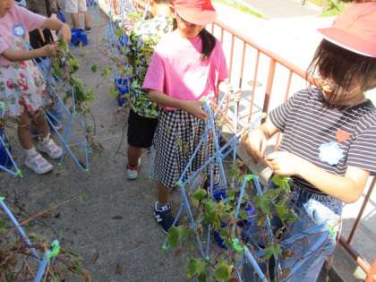 春に種をまき、毎日水やりをしたり観察をしたりして、大事に育ててきたあさがおで、リースをつくりました。切ってしまうことに「さみしい・・・。」と言っている子どももいましたが、新しいものに生まれ変わることに楽しさを感じている子もいました。