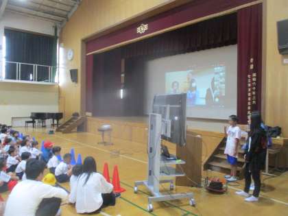 3学年が体育館に集まり、他の学年は教室からテレビ会議で