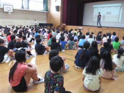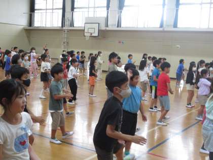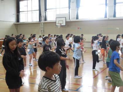 スポーツ大会まで、あと3週間となりました。今年度、3・4年生が取り組む団体演技は、沖縄に伝わる民族舞踊「エイサー」です。どのクラスも教室で動画を見ながら練習に取り組んでいますが、今日のチャレンジタイムは3年生・4年生合同で、体育館で練習をしました。
