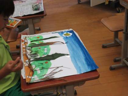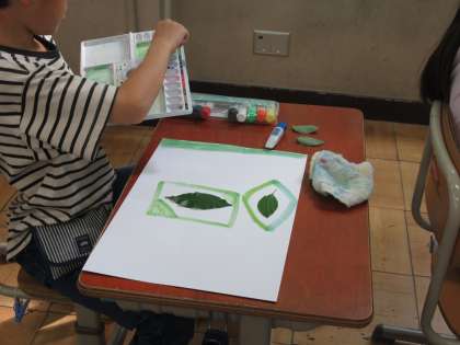 学校にある数々の葉っぱに着目して、本物そっくりの緑色をつくったり、葉っぱからイメージを広げて想像した世界を表現したりしました。拾った葉っぱを画用紙に貼り付けたり、葉っぱに絵の具で着色して画用紙に写し取っている子もいました。