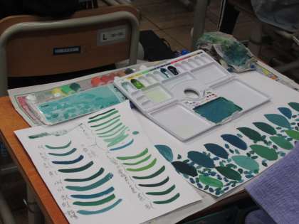 みんなのパレットや筆洗も、さまざまな緑色に染まっていました。