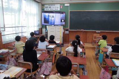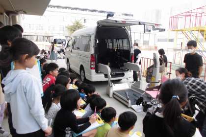 先週の金曜日に、西七条の高齢者福祉施設のオンライン見学と、リフトカー・車いす体験をさせていただきました。オンライン見学では、利用者のみなさんが玉入れを楽しんでおられる姿や手作りされた手芸やはり絵などの作品を見せていただいたり、座ったままで入れるお風呂を見せていただいたりと、普段なかなか見られない施設の中の様子を見せていただきました。また、小学校にリフトカーと車いすを持ってきてくださり、間近で見せていただきました。車いすに乗ったままリフトカーに乗る体験をさせていただいたり、車いすに乗ったり、車いすを押したりという体験もさせていただきました。