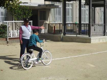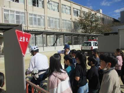 実際に自転車に乗って、止まれの標識や交差点での安全確認について学びました。見通しの悪い交差点では、ゆっくりと出て左右の確認をすることができました。