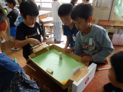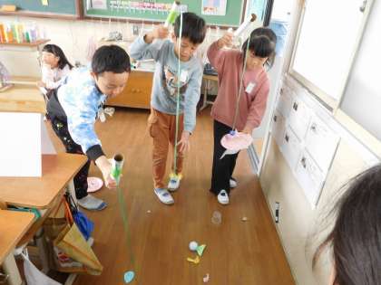 生活科で作ったおもちゃで「あそびパーティー」をしました。子どもたちは、友達が考えたおもちゃで遊ぶことも、自分が作ったおもちゃで遊んでもらうことも楽しみました。