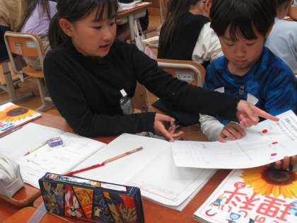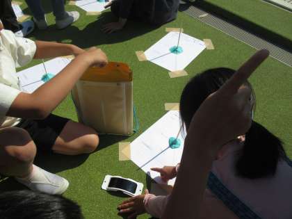 先週の理科の時間には、太陽の位置が1日の間でどのようにかわるのかについて観察しました。観察用紙に記録した棒のかげをもとに太陽の位置を調べて用紙に印をつけました。太陽の位置は、東から南の空を通って、西の方にかわることが分かりました。