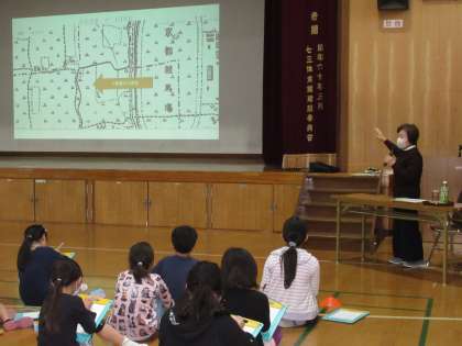 社会科の学習では、「京都市の様子とくらしのうつりかわり」という単元の学習を始めました。今日は、地域の方で子どもたちの大先輩にあたる方をお招きして、昔の学校や地域の様子について、お話をしていただきました。その頃の校舎・給食・休み時間・みんなが好きだった遊びなど、昔の学校の様子や、学校のまわりの様子などについて、たくさん聞かせていただきました。学校のまわりが一面の芹田だったことや、学校から西京極の辺りまで見渡せたことなどに、子どもたちはとても驚いていました。