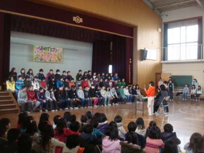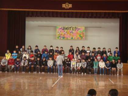 7日(水)に6年生を送る会が児童会主催で行われました。「6年生に楽しんでもらおう」と各学年今まで一生懸命練習してきました。5年生のリコーダー「威風堂々」で入場する6年生。少し緊張気味です。6年生が全員そろい,児童会の挨拶で会が始まっていきました。トップを飾ったのはさくら学級です。おめでとうの言葉のあと,トーンチャイムで素敵な音楽を贈りました。1年生は言葉と歌です。「世界中の子どもたちが」の歌は手話付きで,とってもかわいらしかったです。2年生は言葉と歌です。鍵盤ハーモニカも加わって「思い出のアルバム」を6年生のために替え歌にして歌いました。3年生はリコーダーと歌のプレゼント。今まで一生懸命練習してきた成果を発揮し,素敵なプレゼントとなりました。4年生は歌を贈りました。6年生を送る会にはぴったりの歌詞でした。