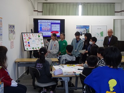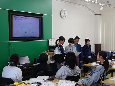 グループで取り組んだ成果を発表している様子です。新商品の開発や、商品のポップづくりなど、ふだん学校ではできない仕事を経験をすることができました。