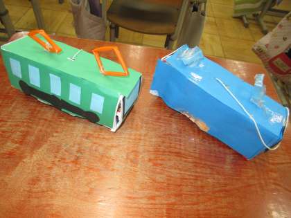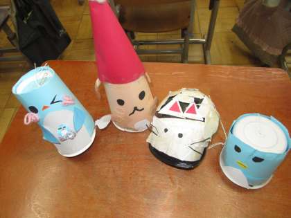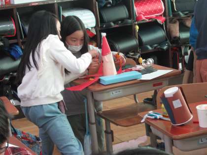 ゴムが切れてしまったり、たこ糸が絡んだりしてしまい、思うように動かないこともありましたが、友だちに教えてもらいながら手直しする様子も見られました。力作がそろいました。