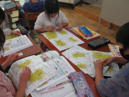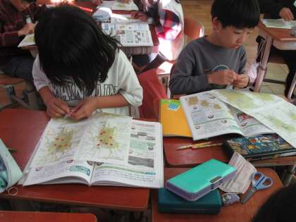 今週は、京都市の土地の使われ方や公共施設の数の変化について調べました。地図からたくさんの変化を発見して、目を輝かせて友だちに伝えました。