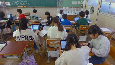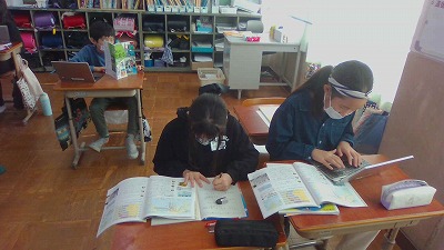 日本の輸出にはどのような特色があるかを調べました。一人でもくもくと調べている人もいれば、友達に相談しながら頑張って調べている人もいました。日本は原料を輸入して、自動車や機械類を多く輸出していることがわかりました。