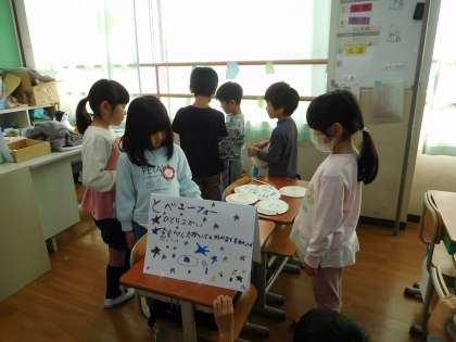 1年生を招待して、あそびパーティーをしました。子どもたちは、この日を楽しみにしていました。最初は緊張していた子どもたちも1年生に「こうやって遊ぶんだよ。」と教えてたり、「いっしょにやってみよう。」と優しく声をかけたりして、お兄さん・お姉さんらしく行動することができました。