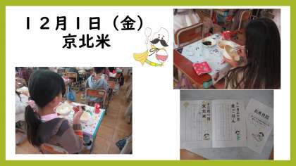 12月1日(金)は、牛乳・ごはん(京北米)あげたま煮・小松菜とひじきのいためものでした。京都市右京区京北地域で育てられた京北米が給食に登場しました。事前に3年生で、京北米が育っている様子や違いが分かりづらいお米のあじわい方を学習し、今日実際に京北米を食べて感想を書きました。「甘くてもちもちしていた。お米がつやつやしていた。作ってくれた人に感謝しながら食べた」などの感想がありました。どのごはんもおかずも味わって食べてほしいなと思います。