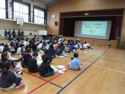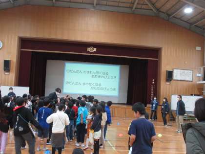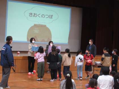 高齢者疑似体験の後には、認知症についてのお話を聞き、実際にどのように接すればよいのかを学ぶ認知症サポーター養成講座を受講しました。「記憶の壺」というゲームを通して記憶しにくくなることについて知ったり、○×ゲームを通して教えていただいたことを確かめたりしました。