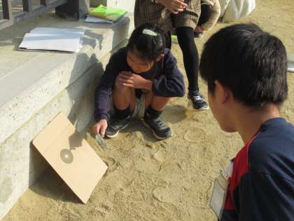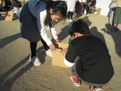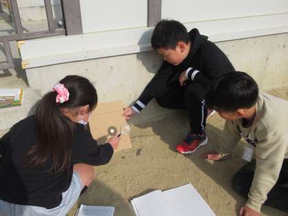今週は、「虫めがねで日光を集めると、明るさやあたたかさは、どのようになるのだろうか」というめあてで実験をしました。段ボールの板に、虫めがねで集めた光を当てました。虫めがねと段ボールの距離をかえたときの明るさやあたたかさについて調べました。