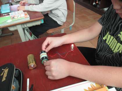 豆電球に早く明かりをつけたくて、初めての学習の日から子どもたちはわくわくした様子。乾電池と豆電球を導線でどのようにつなぐと明かりがつくのかについて、予想してから実験しました。自分の予想通りの結果が出たり、予想と違うつなぎ方でも明かりがついたりして、みんな喜んだり驚いたりしながら実験をすすめました。