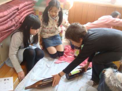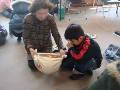 3月15日(木)に地域の女性会の方に来ていただき,風呂敷の便利さや使い方などを教えていただきました。風呂敷はもともと,お風呂屋さんで下に敷いて着替えたことからその名前がついたそうです。物を包むだけでなく,首に巻いたり膝にかけたりして寒さをしのぐこともできます。また,様々なものを包むことができる風呂敷。子どもたちはスイカに見立てたボールを包んだり,一升瓶を包んだり,大きな箱を包んだりしました。いろいろなものを包んでいく中で,子どもたちは先人の知恵や日本独特の伝統文化を学びました。