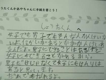 手紙や振り返りの文章からは「男子だから、子ども大統領というきまりはない」「女子だっていろいろな力をもっていて(中略)子ども大統領になれる」「子ども大統領にはだれでもなれる」「男子だから○○、女子だから○○という考えはおかしいことを改めて考えられた」「男女区別するべきか、しないべきかを考えて判断したいです」「「男子だから〜、女子だから〜というのは関係なく、おたがいにいいところがあるなと改めて思いました」「男子だから○○、女子だから○○というものをなくしていきたいと思いました」などの記述が見られ、教材文をもとにこれまでの自分の考えを振り返ったり、今後の生活に生かしていきたいことを考えたりすることができていました。