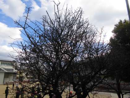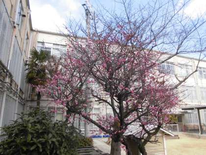 職員室玄関をはさんで右側はピンクの梅の花。