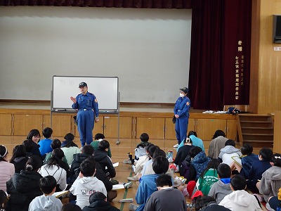 ハナヤ学習「守れ七三校区!ジュニア防災隊」の学習で、災害が起こったときに自分たちができることについて、ゲストティーチャーの方に教えていただきました。