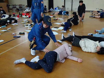 回復体位や直接圧迫止血法など、身の回りのものにある道具で救護する方法について教えていただき、実際にもやってみました。お忙しい中、たくさんのことを教えていただきました。ありがとうございました。