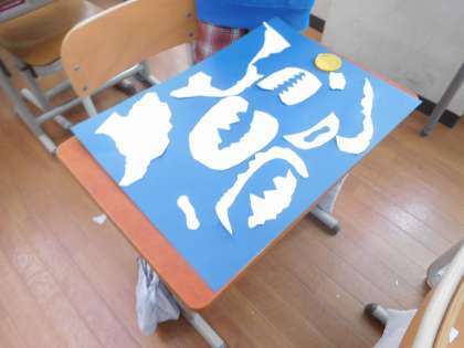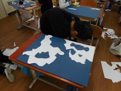 ハサミで画用紙を切りました。丸くグルグル、まっすぐスイスイ、紙を傾けてジグザグ。様々な切り方をしました。切ったものの向きを変えるなど、台紙への置き方を考えました。色々試すうちに、どんどんイメージが広がっておもしろい世界が見えてきました。