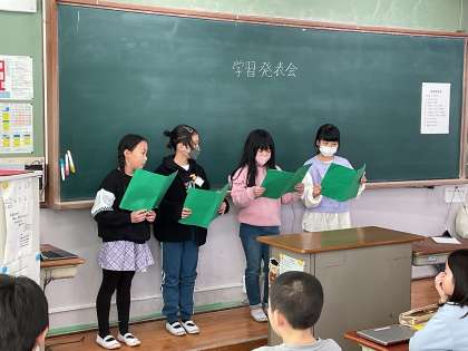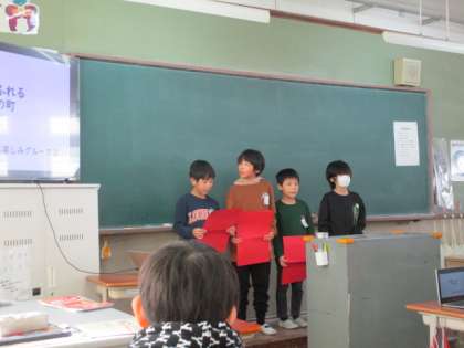 どの学級も、3年教室と4年教室に半数ずつ分かれて、グループごとに発表しました。4年生児童と保護者の方に発表を聞いていただきました。