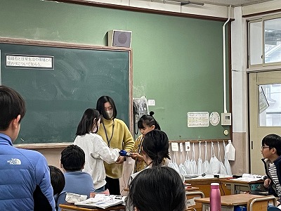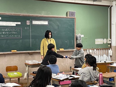 理科の学習では、身のまわりで電磁石がどこで使われているかを話し合い、その後大きな電磁石をひっぱる実験をしました。二人でひっぱりあっても、なかなか離れませんでした。