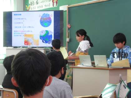 テーマは「地球環境、エコライフ チャレンジ」です。3年生にとっては少し難しい内容もありましたが、みんな一生懸命、4年生の発表を聞きました。発表内容をより説得力のあるものにするために、事前にアンケートをとり、その結果を示したり、写真や図など分かりやすい資料を用いたりするなど、「さすが、4年生!」といった発表がたくさんありました。