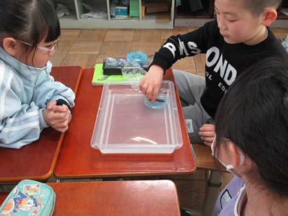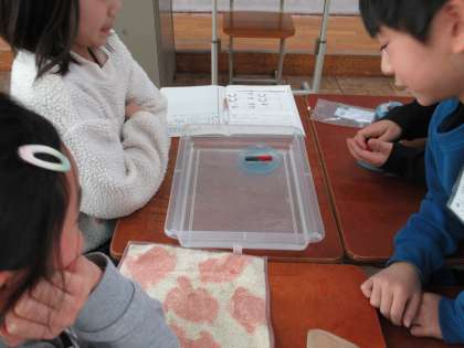 容器に入れて水に浮かべた棒磁石と糸を結び付けてつるしたU字磁石を使って調べました。おもしろいことに、どのグループの磁石も、N極が教室の北の方向を指す結果となりました。みんな驚きの声をあげていました。