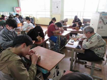 児童は一人一人、篆書体で自分の名前の一文字を鉄筆を使って彫りました。