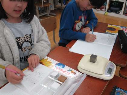 前回の理科の学習で重さを調べた紙コップとプラスチックのコップ。子どもたちの予想では、「紙コップの方が重いのではないか。」という意見が多かったのですが、実際はプラスチックのコップの方が重いという結果でした。「でも、大きさをそろえないと分からないと思う。」という意見が出て、比べるものの体積をそろえて、ものの重さを調べる実験をしました。