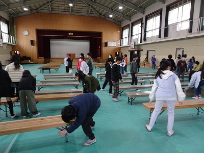 5年生も残りわずかとなりました。今日は卒業式の準備で、長椅子並べと体育館の掃除をしました。みんなで協力しててきぱき行動している姿が素晴らしかったです。卒業式の準備は万端です。