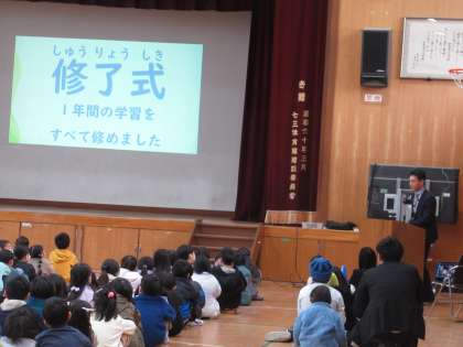 3月25日は、本年度度最後の1日でした。修了式を体育館で行った後、教室で一人一人に通知票を渡しながら、この一年間のがんばりや成長をふりかえりました。 クラスによって、先週のお楽しみ会の続きをしたり、お別れする教室をもう一度きれいに掃除し直したりするなど、最後の時間を大切に使いました。