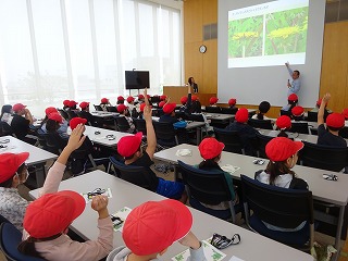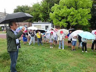 天気は残念ながら雨でしたが、植物や生き物についてクイズに答えたり、クラスごとにビオトープの中を回ったりしました。