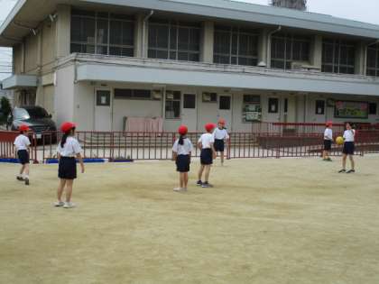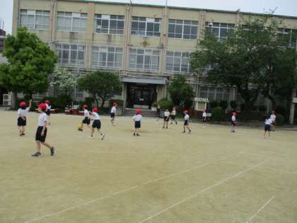 体育科「体ほぐし」の学習で、ボールを使った活動をしました。グループでいろいろなパスをつないだり、ボール送りリレーをしたりしました。体を思いっきり動かして楽しみました。