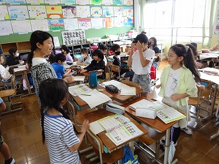 4年音楽「音楽で心の輪を広げよう」グループで話し合って