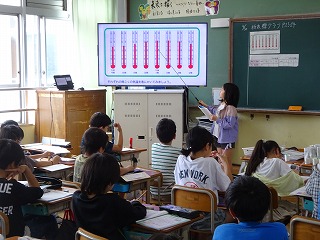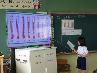 表とグラフを関連付けながら、折れ線グラフの特徴を確かめることができました。折れ線グラフの学習は、理科「天気と1日の気温」にもつながっていきます。教科をこえたつながりを大切にしながら、折れ線グラフを使っていきたいと考えています。