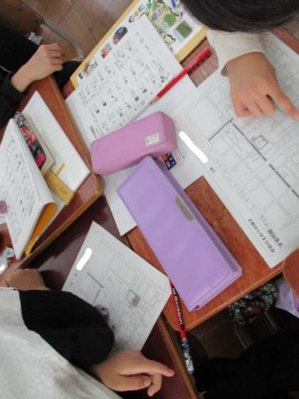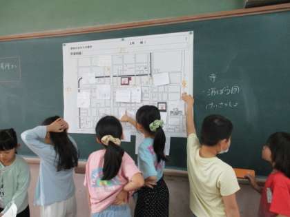 「このあたりに温泉があった気がする!」「小学校の近くに交番があるのは、もしもの時にすぐに出動するためかな。」などと話しながら頑張りました!