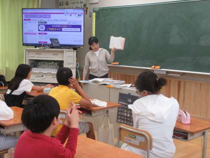 学校司書の先生にお世話になり、図書館オリエンテーションを行いました。校内の図書館の使い方には十分慣れているのですが、今回は地域の下京図書館を例に、公共図書館ならではの展示資料やサービスについて教わりました。学習の後半では、著作権についてクイズを通して学びました。