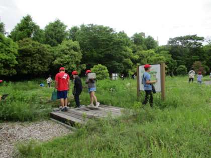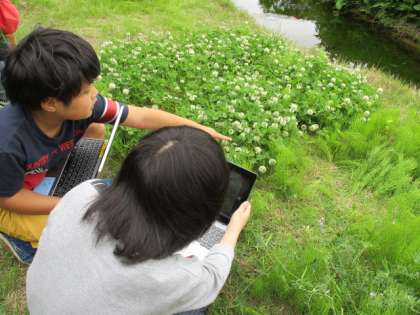 GIGA端末を使って見つけた生き物を撮ったり、生き物の様子を観察したり、のびのびと過ごす様々な子どもたちの姿が見られました。