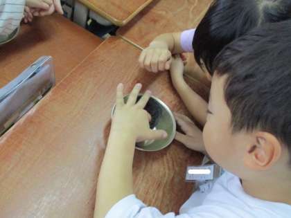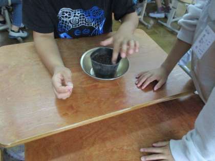理科「たねをまこう」の学習では、ひまわりとホウセンカの種の観察をしました。「よく見るとへこんでいるところがある。」「黒だけではなく、茶色のところもある!」と話していました。虫眼鏡を使って詳しく調べることができました。